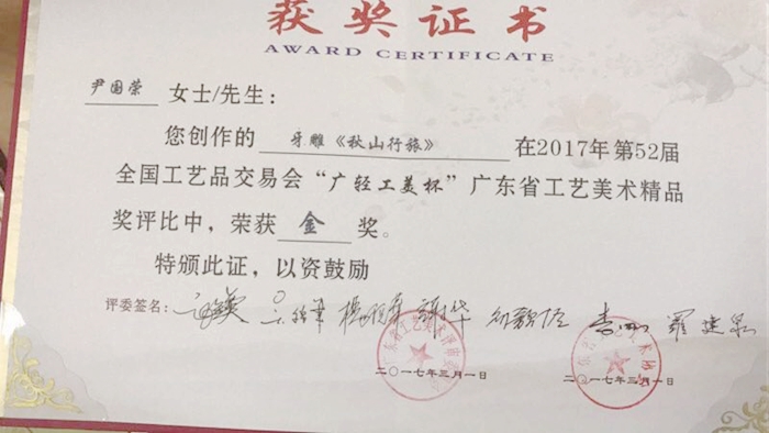 尹国荣,一次偶然的机会与猛犸牙雕结下了一辈子都化不开的缘分,选择了猛犸牙雕可以说是尹国荣大师的一个人生转折点,如今,已从事20余年牙雕行业的他有着自己独特的雕刻风格,一刀刀的付出与坚持也让尹国荣大师在这条路上越走越远。尹国荣大师有过很多的获奖作品,这件牙雕《秋山行旅》,采用了上等的猛犸牙材料,做工难度大,耗时长。尹国荣用他纯熟的技法让作品的人物雕刻显得活灵活现,细节刻画到位,勾勒出了一幅秋日玩乐愉快美好的场景画面,具有很高的欣赏价值与收藏价值。尹国荣大师的这件牙雕《秋山行旅》在2017年第52届全国工艺品交易会“广轻工美杯”广东省工艺美术精品奖评比中,荣获金奖。